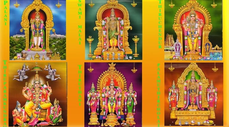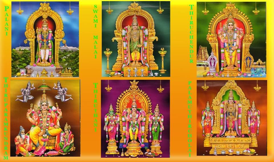 The Six Abodes of Murugan are Thiruparankundram - Arulmigu Subramaniyaswamy Temple, Tiruchendur - Arulmigu Subramanya Swami Temple, Palani - Arulmigu Dhandayuthapani Swamy Temple, Swamimalai - Arulmigu Swaminatha Swamy Temple, Tiruttani - Arulmigu Subramanyaswamy Temple, Pazhamudircholai - Arulmigu Solaimalai Murugan Temple.